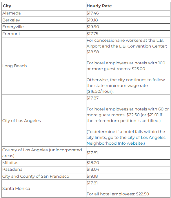 On July 1, 2025, minimum wage increases will go into effect in certain cities and counties in California. In the City of Los Angeles, the minimum wage will increase from $17.28/hour to $17.87/hour. For hotel employees at hotels with 60 or more guest rooms, the minimum wage will increase to $22.50/hour. (Note: A referendum petition was filed against the Hotel Worker Minimum Wage Ordinance on May 23, 2025, and is being reviewed. If it is certified, the rate on July 1, 2025, will be $21.01/hour.)