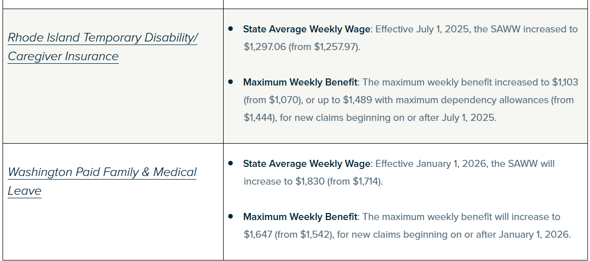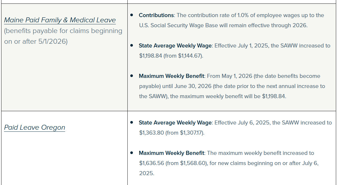 It is that time of year again when about half of the state paid family and medical leave (PFML) programs have announced changes to their contribution rates and benefits. A few programs have also announced a new state average weekly wage (SAWW), upon which the maximum weekly PFML benefit calculation is based. Some of the changes are effective now, while others were recently announced with an effective date of January 1, 2026.