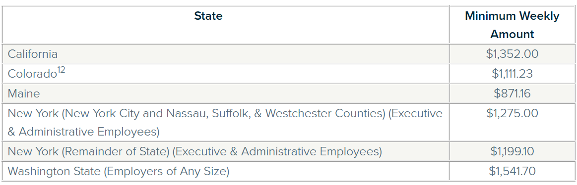 Executive, Administrative and/or Professional Employees: Under federal law, these exempt employees must be paid on a salary or (for only administrative or professional exemptions) fee basis, and the weekly minimum amount is $684 per week. The following states have minimum pay requirements that exceed the federal rate and will change on January 1, 2026.