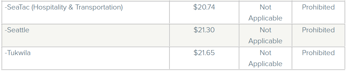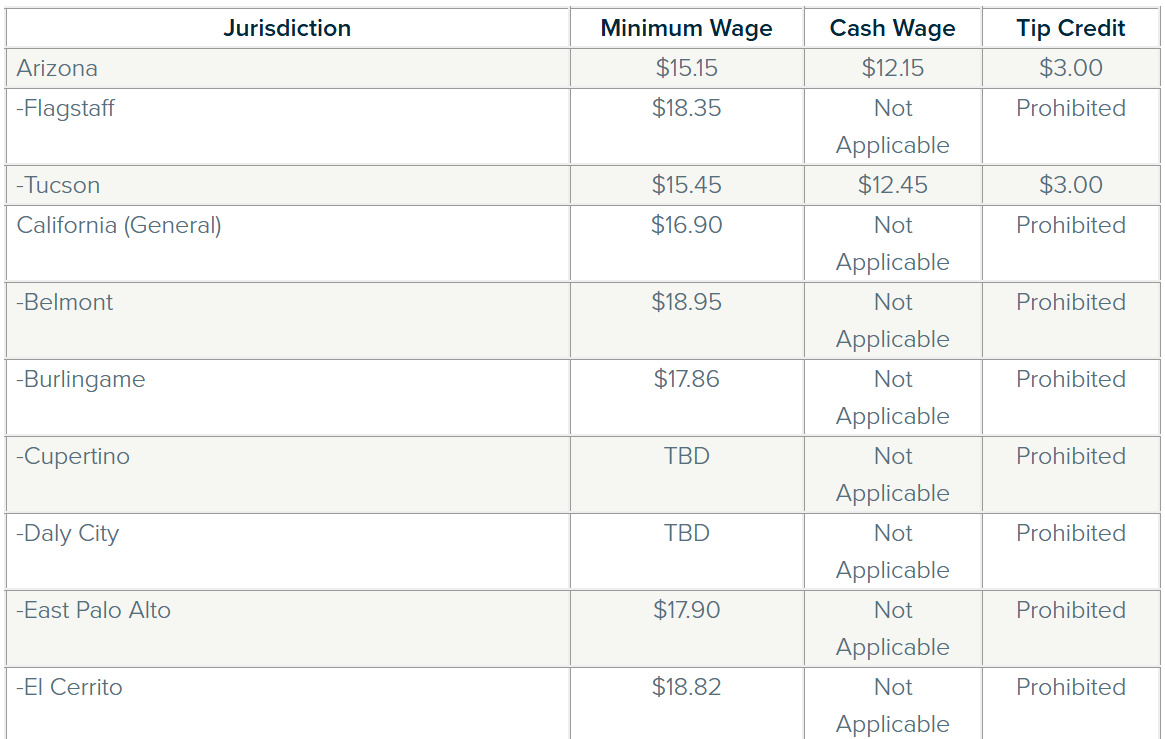 Certain jurisdictions might have a multi-tier minimum wage that varies depending on factors like the number of employees a business has, the type of worker, etc. Additionally, a particular rate might be on a different update schedule. In the below chart we focus solely on the rate(s) in a jurisdiction that change(s) on January 1, 2026. The only exception will be when there is a change to a local minimum wage but not the state minimum wage. Employers with questions about other rates applicable in a jurisdiction that are not changing on January 1, 2026, should contact counsel.