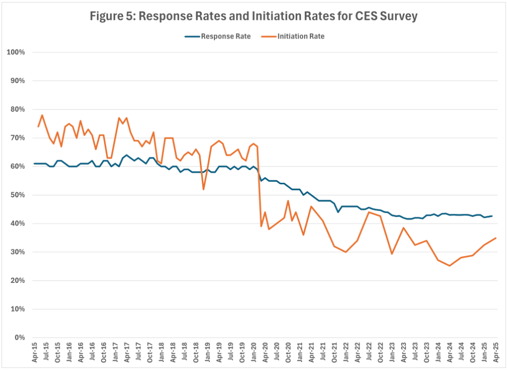 Figure 5 shows that the response rate for the CES has declined from just over 60% during the period 2016 to 2019 to less than 43% over the past two years making payroll employment estimates less reliable and less accurate than in earlier years.[11] Figure 5 also shows that the initiation rate, or the rate at which new establishments are successfully brought into the CES survey, has declined from over 70% in 2015 to less than 40% over the past year.