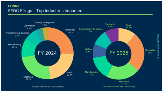 In terms of filings by industry, FY 2025 aligned with prior years and reflected the EEOC’s focus on a few major industries. In FY 2025, two industries remained among the EEOC’s top targets – hospitality and healthcare.