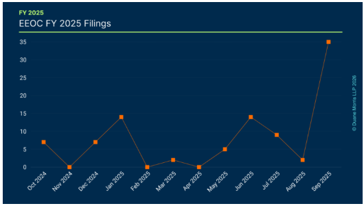 Unlike other fiscal years, during 2025, the EEOC’s filing patterns were consistent in the first half of FY 2025, peaking with 14 lawsuits in January. Filings again slowed until the summer, when the EEOC filed another 14 lawsuits in June 2025. Thereafter, lawsuit filings dipped until the “eleventh hour” in September. The following shows filing activity by month: