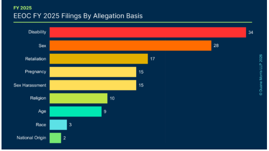 The grounds for such claims are reflect the stated priorities of the Trump Administration, including by reflecting a decreased emphasis on targeting alleged racial discrimination, and an increased emphasis on routing out disparate treatment based on gender and health-related and family-related conditions. Claims based on alleged disability discrimination, sex discrimination, and retaliation led the way. Collectively, these three theories provided the foundation for 59.4% of FY 2025 EEOC filings.