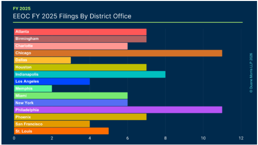 As in FY 2024, Philadelphia proved itself as a leader in EEOC enforcement filings. Chicago remained steady with 11 filings, the same as FY 2024. St. Louis (two filings in FY 2024) and Phoenix (four filings in FY 2024) showed increases in filing numbers as compared to FY 2024.