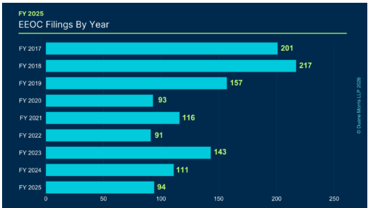 In several respects, FY 2025 represented a hard pivot in enforcement targets. While total filings decreased, the new administration foreshadowed a new direction and targeted approach in upcoming EEOC enforcement.